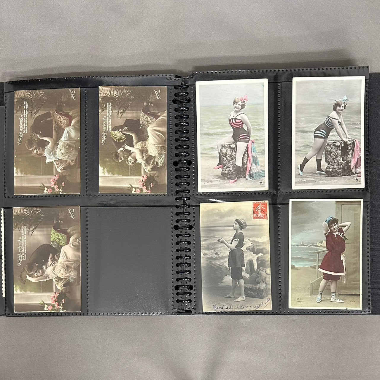 水着姿の楽し気な表情をした女性、大きなアルファベット一文字が組み込まれている絵葉書があります。ファー付きの服や、沢山の装飾を身に着けた華やかな姿の女性の絵葉書もあります。女性と男性が写る、カラフルに彩られた鮮やかな絵葉書は華やかです。