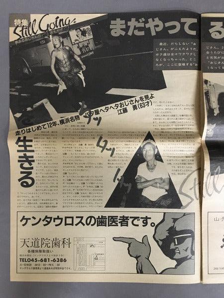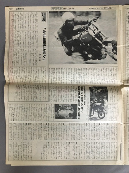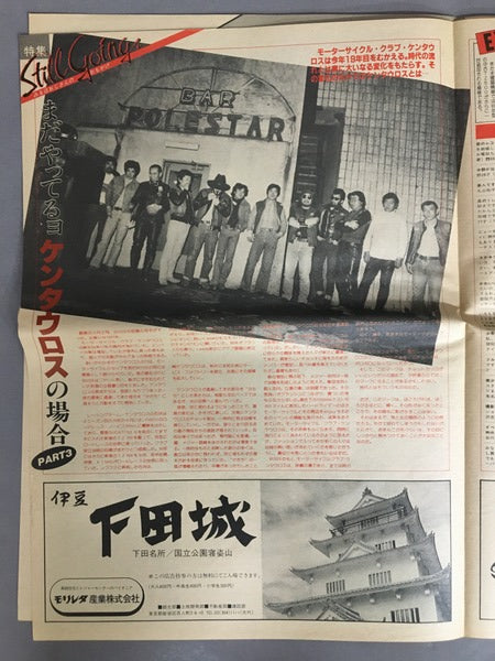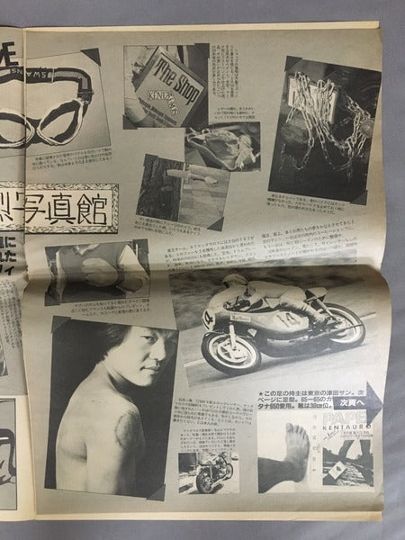 横浜に存在する伝説のバイク乗り集団、ケンタウロスの機関誌です。挑戦的な走行やレースに関する報告、バイク乗りによる体験談、活躍するメンバーの紹介などで構成されています。後に能の舞台を主宰するケンタウロスは舞台芸術への造詣も深く、ケンタウロスのボスと麿赤児の対談、大野一雄へのインタビューなども載っています。写真はメンバーであるカメラマン、設楽宗利によるもの。新聞に近い判型の雑誌です。